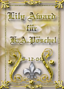 Daher möchte ich euch heute meinen Lily-Award in Silber mit der ID: S-12-04 überreichen. Ich wünsche euch auch für die Zukunft so viele Einfälle für eure Webseite und eine Menge netter Besucher.