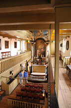 Wir sehen uns ein bisschen um, bewundern Orgeln, Holzdecke und Buntglasfenster. Von den Orgeln gibt es gleich 3: die alte, die kleine und die Kabinett-Orgel. Die Reste einer Ausstellung über Burma verstellen uns jedoch die Sicht auf Details und so gehen wir bald wieder.