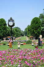 Besonders beeindruckend ist der lange, gerade Rasenstreifen, der den Park von Norden nach Süden durchquert. Überall sind blühende Beete, Amphoren und Figuren wie aus Alice im Wunderland verstreut und beleben das Bild. Dass es so gepflegt ist hier, dafür sorgen zahlreiche Gärtner:innen, die wir jetzt in der größten Hitze beim Graben und Schnippeln beobachten können.