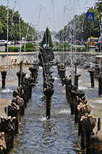 Der Boulevard Unirii ist in seiner ganzen Länge von einem Mittelstreifen mit Springbrunnen geziert und Karin nutzt die Gunst der Stunde - weit und breit kein Uniformierter zu sehen - um die heißen Füße im Nass zu kühlen. Nach Fotos sowohl in Richtung Parlament als auch in Richtung Piata wandern wir in Schatten und Duft er Lindenbäume die 4,5 km ins Zentrum.