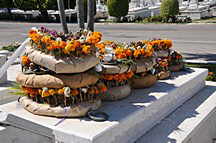 Für uns ist auffällig, dass es so gut wie keine Blumen hier gibt. „Die gehören nach Hause in die Vase aber nicht auf den Friedhof” meint Evelio. Wahrscheinlich hat er schon recht, dass die Lebenden mehr Freude an einem bunten Strauß haben. Eine Ausnahme bildet das Grab von Amelia Goyri. Sie wird auch La Milagrosa, die Wundertätige, genannt und gilt als Beschützerin kranker Kinder und unfruchtbarer Frauen. Natürlich gibt es zu Amelias Wundertätigkeit ein Legende.