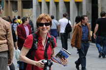 Die vielen Cafés und Restaurants, die in den Arkadengängen und unter den Sonnenschirmen am Platz ihre Tische gedeckt haben, reizen mangels Aussicht momentan mehr die Aussteller als die Touristen. Auch wir können dem Automessenflair nichts abgewinnen und folgen lieber dem vorgeschlagenen Weg aus unserem Reiseführer.