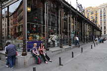 Beim Mercado San Miguel lassen wir uns auf ein Bierchen im Schanigarten eines Irish Pub mit Blick auf die Markthalle nieder. In der Halle aus Glas und Gusseisen, die alleine für sich schon eine Sehenswürdigkeit darstellt, gibt es Delikatessen aller Art. Frische Früchte, Tapas aus allem, was dem Gaumen auch nur irgendwie schmeicheln könnte und Alkoholika der besten Sorten. Wie machen die Spanier das nur, dass sie nicht dick sind?