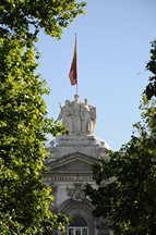 Wir gelangen auf die Plaza de la Villa de Paris, wo hinter einem Park mit Platanen der Palacio de Justicia zu sehen ist. Der frühere Klosterbau brannte im Jahre 1915 vollständig aus, wurde aber bereits kurze Zeit später wieder aufgebaut. Heute befinden sich sowohl das Justizministerium Spaniens als auch der Oberste Gerichtshof, das Tribunal Supremo, in dem Gebäude, was ihm auch seinen Namen gab. Verantwortlich für den Bau am Plaza de Villa de París war der Architekt Joaquín Rojí.