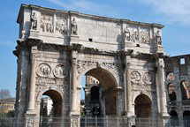 Nach dem Kolosseum geht es vorbei am Konstantinsbogen zu Palatino und Forum Romanum. Am 28. Oktober 315 n.Chr. wurde dieser Triumphbogen eingeweiht und erinnert an den Sieg Kaiser Konstantins über seinen Rivalen Maxentius. Der Bogen ist eigentlich ein Recycling verschiedenster Bauwerke.