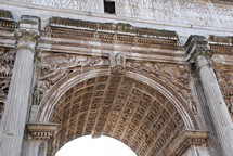 Es finden sich darin Reliefes aus der Zeit Marc Aurels, der 300 Jahre zuvor gelebt hatte, Säulen und andere Teile vom Trajansforum und Seitenfronten von Bauten Hadrians. Lediglich die Abbilder Konstantins sind neu hinzugekommen um tatsächlich den Kaiser zu zeigen und nicht einen seiner Vorgänger.