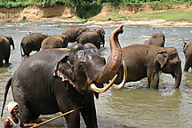 Eine ganze Heerschar Elefanten - etwa 50 - tauchen Stück für Stück auf und begeben sich in das nur wenige Zentimeter tiefe Wasser. Einige der Dickhäuter sind wahre Wasserratten, welche gleich sich selbst und ihre Artgenossen mit Wasser besprühen. Andere zieren sich ein wenig, werden aber durch Zurufe oder leichte Stockschläge von ihren Wärtern auf den richtigen Weg - ins Wasser! - gebracht.