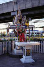 Während der Fahrt durch Bangkok zeigt uns Kanithar die vielen kleinen Geisterhäuschen, welche fast neben jedem Gebäude stehen. Diese sind fast immer kunstvoll gestalteten und haben oft die Form eines vogelhausartigen Mini-Tempels. Sie sollen den Geistern, die einst das Grundstück bewohnten, eine neue Heimat geben und vor Unheil schützen. Entsprechend liebevoll werden die guten Geister versorgt, es stehen vor jedem Häuschen entweder frische Blumen, Essen oder auch mal eine Flasche Cola mit Räucherstäbchen. Teilweise sind sie auch mit bunten Lichterketten geschmückt.