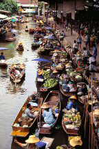 Auf den Booten und in den vielen kleinen Geschäften an Land wird alles Mögliche verkauft. Von verschiedenen Souvenirs für Touristen über allerlei Früchte und Lebensmittel - alles ist hier zu erwerben. Auch sehen wir viele Einheimische, welchen ihren Bedarf abdecken und einkaufen gehen. In Garküchen (diese sind tw. auch auf den Booten!) werden traditionelle thailändische Speisen zubereitet. Das Geld und die Ware wandert dabei von Hand zu Hand, von Boot zu Boot, manchmal über mehrere andere Boote, die dazwischen liegen. Hier herrscht ein reges Treiben.
